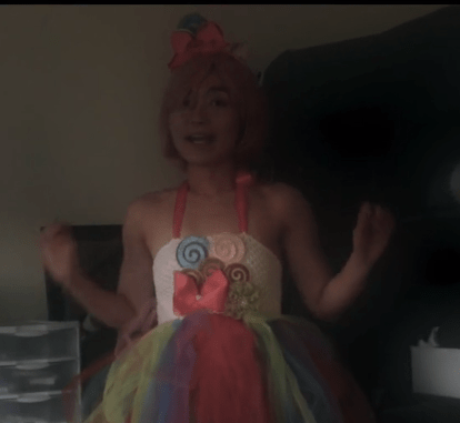 Through a plot devise worthy – and executed often – by Rod Serling, we meet the authors younger, more fun and funny self. Garbed in kitty socks and a pink wig we meet the other side of the author – and the other side of Yiqing. Having convinced us that she is dark and serious, we now see her as a young girl – playful and silly – even dancing and hopping all around the nondescript apartment.